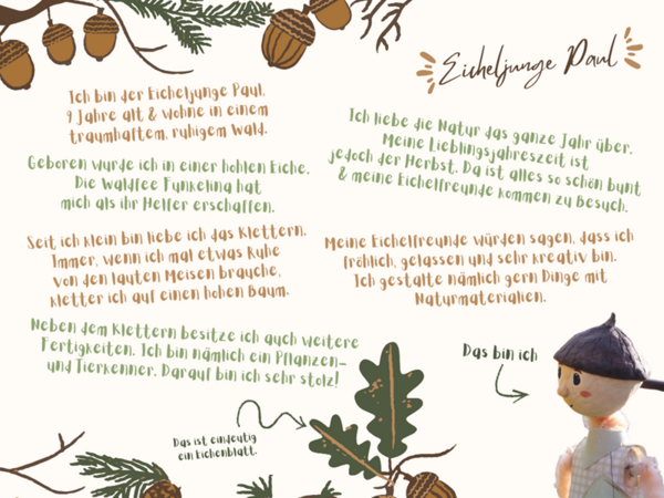 Eine herbstliche Collage mit der selbst gestalteten Puppe Pauli, die einen Eichelhut trägt, an einer Sonnenblume steht und Bienen beobachtet und Kastanienfiguren bastelt.