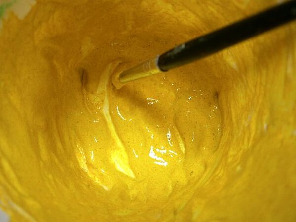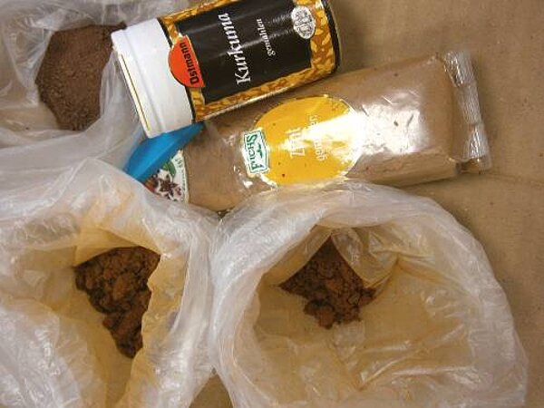 Mit Kurkuma (gelb), Kakao und Kaffee haben wir selbst Farben erstellt: echte Ei-Tempera-Farbe. Ein paar synthetische Pigmente bereicherten die Farbpalette.