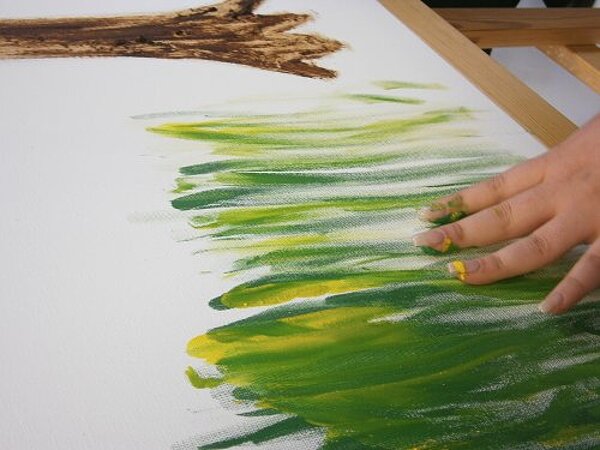 In Gruppenarbeit entwickelten die Schüler der Klassen 11b und c Ideen, die dann gemeinsam auf die Leinwände gebracht wurden. Auch hier durfte viel ausprobiert werden: Malen mit Fingern, Schwamm und allem, was spannend ist.