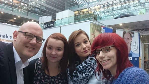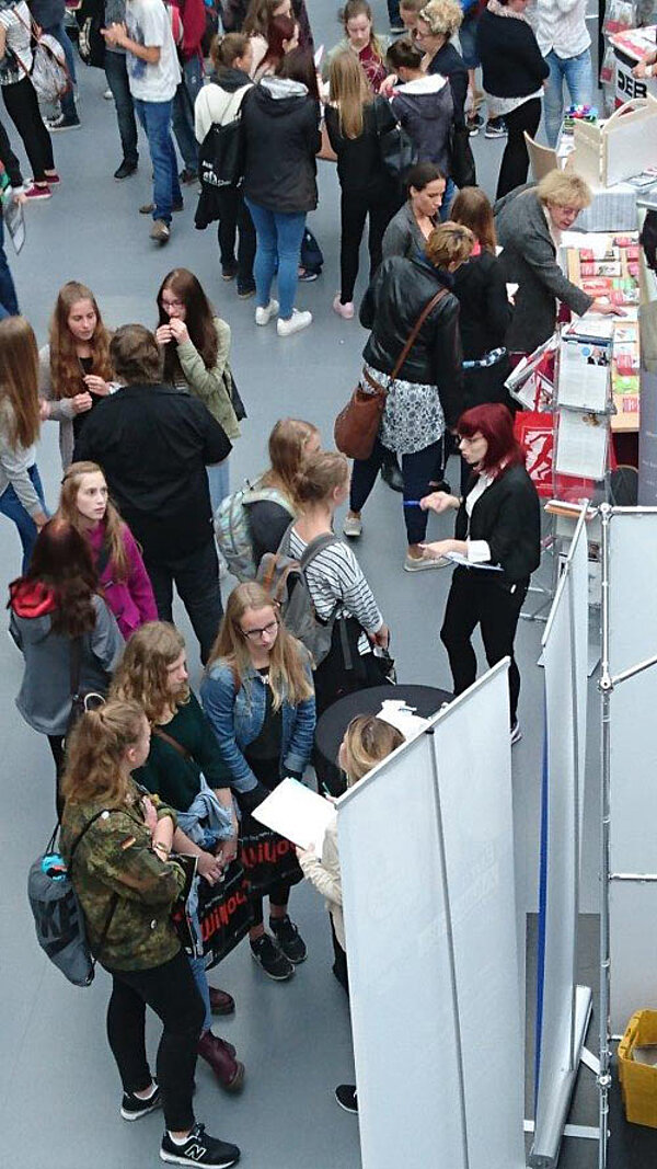 Wir waren mit jeweils zwei Auszubildenden zum <link internal-link zum>Europakorospondenten und zum <link internal-link zum>Erzieher am Ausbildungsstand präsent, was bei fast 2000 Besuchern notwendig war. Die Auszubildenden haben umgesetzt, was sie im Unterricht in Deutsch/Kommunikation gelernt haben: Sie waren offen für die Schüler, begegneten den jungen Menschen mit einem Lächeln und legten eine überzeugende Mimik und Körpersprache an den Tag. Genau diese Punkte machten den Unterschied zu anderen Ständen. Wir unterhielten uns oft mit mehreren Interessenten gleichzeitig und hatten immer zu tun.