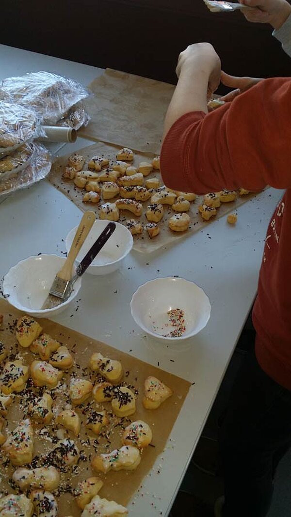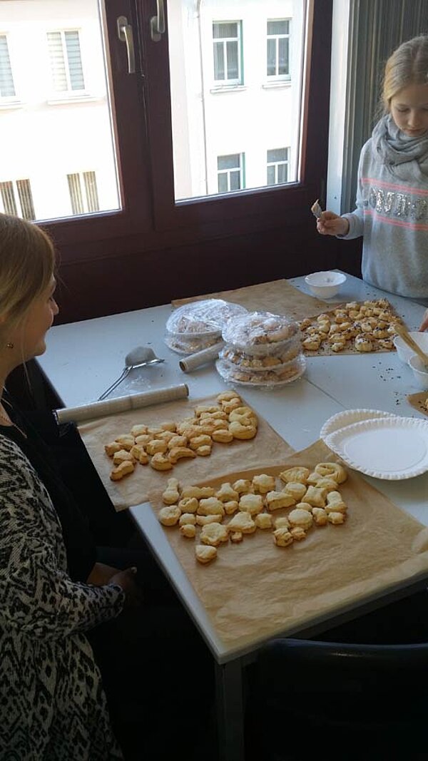 Während die einen also kleine Geschenkeschachteln, Karten und Stecker bastelten, aus Nudeln kleine Weihnachtsengel entstehen ließen, schoben die fleißigen Bäcker schon den ersten Schwung Plätzchen in die Backröhren. Bald roch es verführerisch im ganzen Haus. Und dem einen oder anderen lief förmlich schon das Wasser im Munde zusammen.
