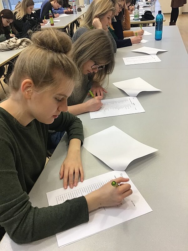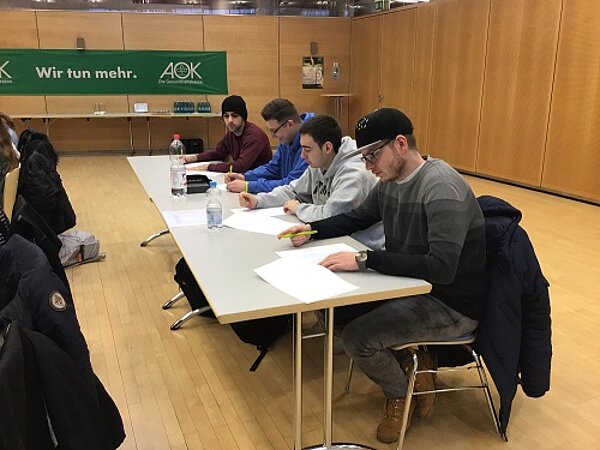 So schwitzten die EMAs und FSK-ler vergangenen Freitag unter Echtzeit-Bedingungen bei einem Einstellungstest. Sie erlebten ein simuliertes Vorstellungsgespräch zwischen AOK-Referentin Carola Herrmann und einer EMA-Schülerin; zudem konnten sie Fragen loswerden wie "Muss ich auf zu private Fragen antworten?" und: "Wird ein Lebenslauf immer unterschrieben?". Mit kompetenten Antworten und vielen Anregungen im Gepäck endete dieser Unterricht der anderen Art.