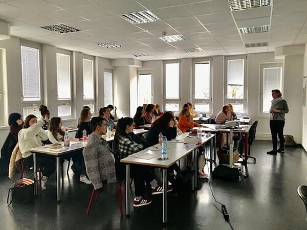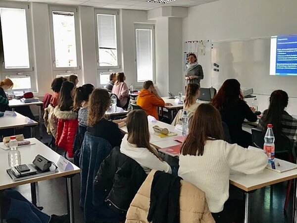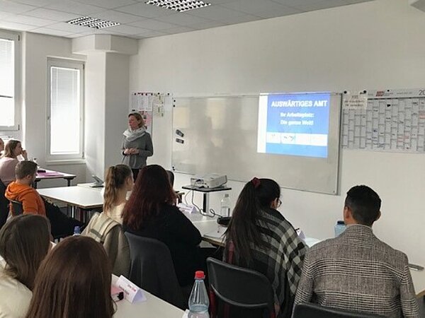 Interessiert hörten die angehenden <link _blank internal-link>Fremdsprachenkorrespondent*innen der Euro Akademie Berlin dem Vortrag zum Berufsbild des*r Fremdsprachenassistent*in im Auswärtigen Dienst zu, den die Ausbildungsreferentin Frau Crawford-Reed am 29. Oktober 2019 hielt.