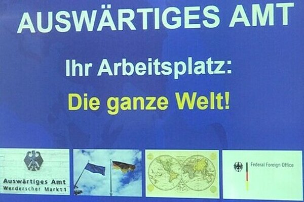 Sie gab fachkundige Einblicke in den Bewerbungsprozess, das Rotationsprinzip im Auswärtigen Amt, die besondere Eignung und Bereitschaft zum Leben und Arbeiten auch in Krisengebieten, die große Verantwortung als Repräsentant*in der Bundesrepublik Deutschland im Ausland und in die Entwicklungs- und Verdienstmöglichkeiten.