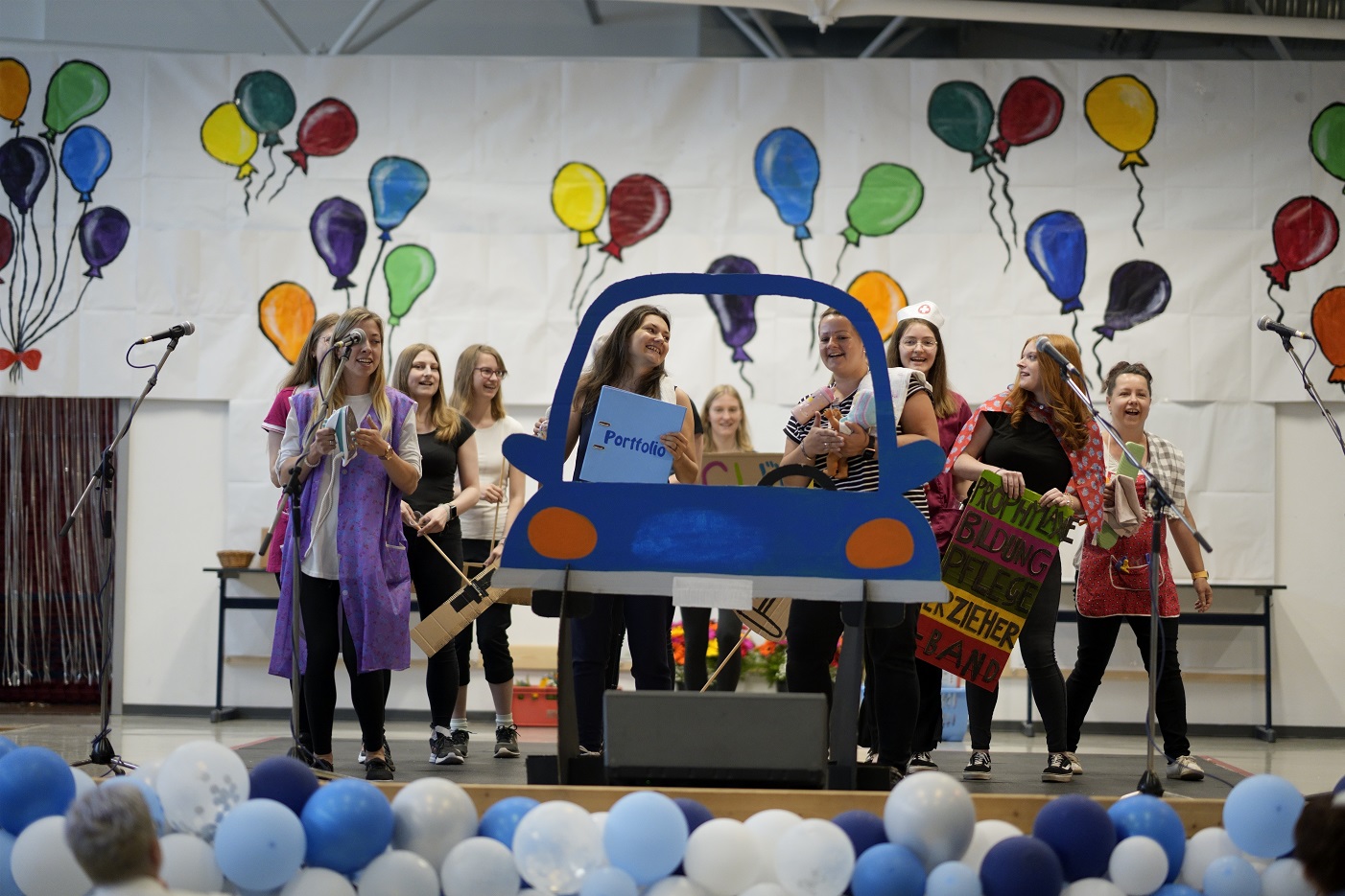 Zehn junge Frauen stehen in einer Reihe auf einer Bühne vor einem Plakat, auf dem bunte Luftballons gemalt sind. Sie tragen festliche Kleidung und in den Händen halten sie ein Dokument und Blumen.
