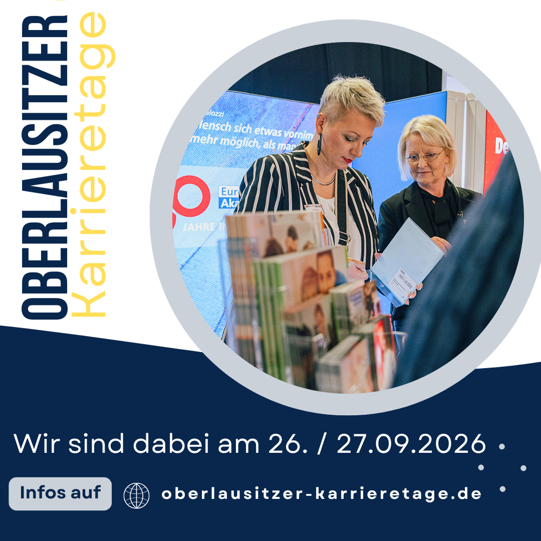 Wir sind mit einem Stand bei den Oberlausitzer Karrieretagen vor Ort und über spannende Karrieremöglichkeiten in den Bereichen Pädagogik und Soziales sowie Gesundheit und Pflege.